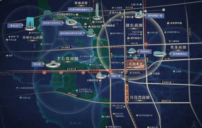 项目地处奥体南板块核心,承接湖东CBD与奥体商业资源,依托地铁5/8号线及苏州东站(规划中)形成交通枢纽,定位为园区高端低密居住区