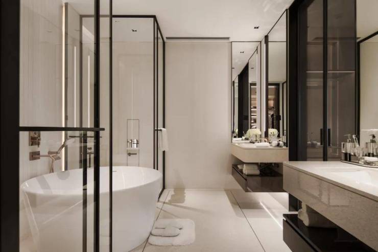 大堂铺就土耳其白砂和意大利卡拉拉白,楼层公区墙面地面漫铺“深圳湾一号同款”的阿曼玫瑰石材,还有景泰蓝……室内的装标更是高达18000元/㎡。