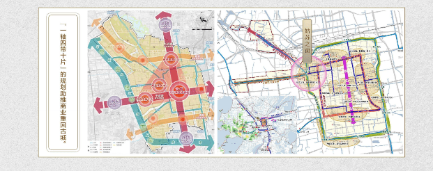 纳四山四水千年灵韵,京杭运河玉带环腰,三水交汇活财汇聚。