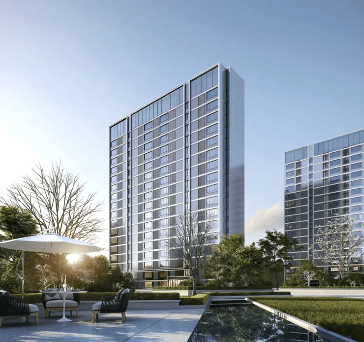 交付标准:精装交付,配备地暖、新风、中央空调“三大件”,外立面采用铝板 + 石材,呈现现代简约风格。