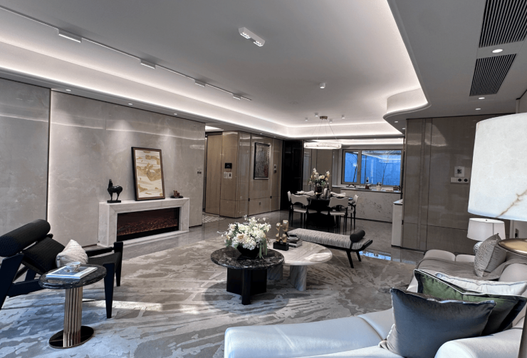 精工细节体系:玄关/卫浴拼花地砖、人字拼木地板;全屋弧形吊顶系统,提升视觉层高;极窄边框淋浴屏,营造通透空间感。