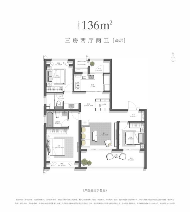 3.建面136㎡3居:户型价格500-550万/套,建筑面积136m²,户型结构为平层,朝向南,关联楼栋为5号楼边户。售罄