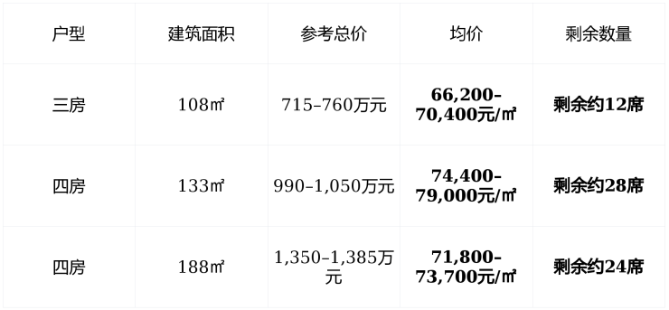 剩余房源 : 总规划约86套,当前仅剩东社区最后64套纯四房产品,108㎡三房已售罄,188㎡大户型稀缺,售楼处反馈“日均到访超120组,周末单日成交超20组” ;