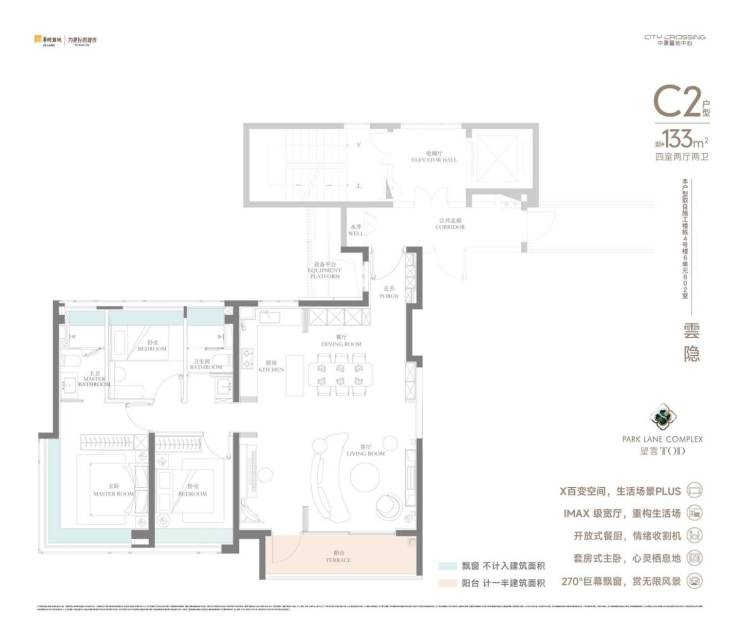 188㎡四房:四房三卫,独立入户玄关,主卧套房+双卫+双阳台,类一梯一户设计,私享电梯厅;