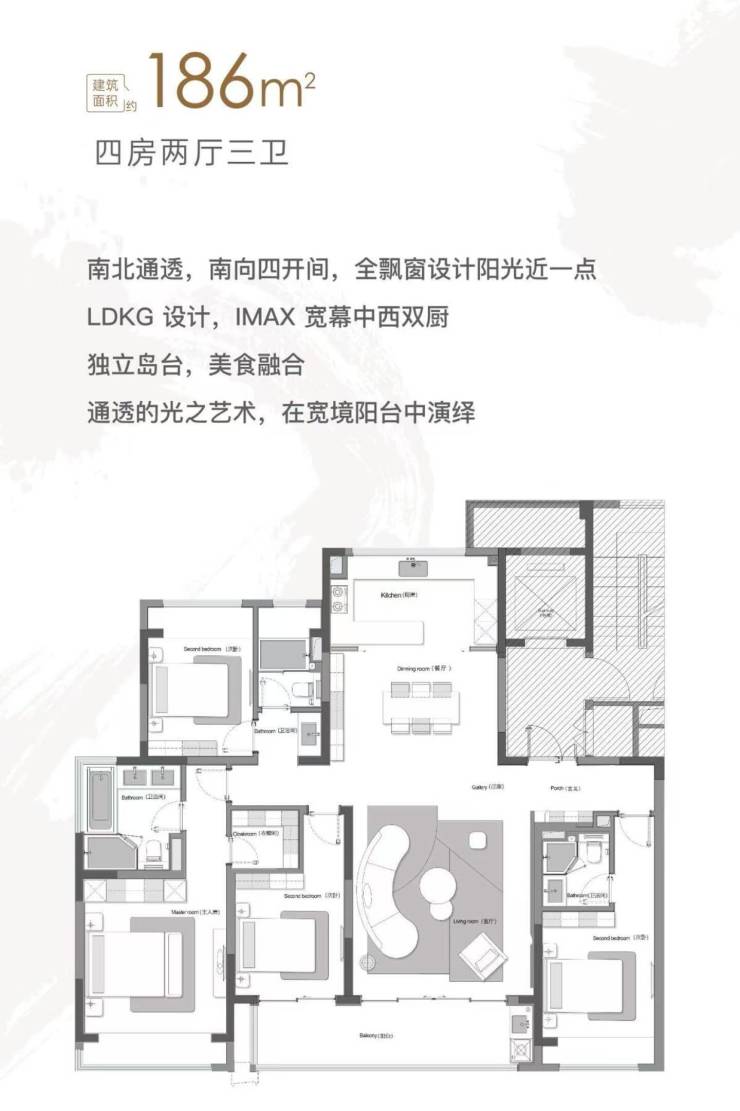 户型设计 :LDKB一体化布局,四开间朝南,主卧套房+独立衣帽间,满足三代同堂生活需求