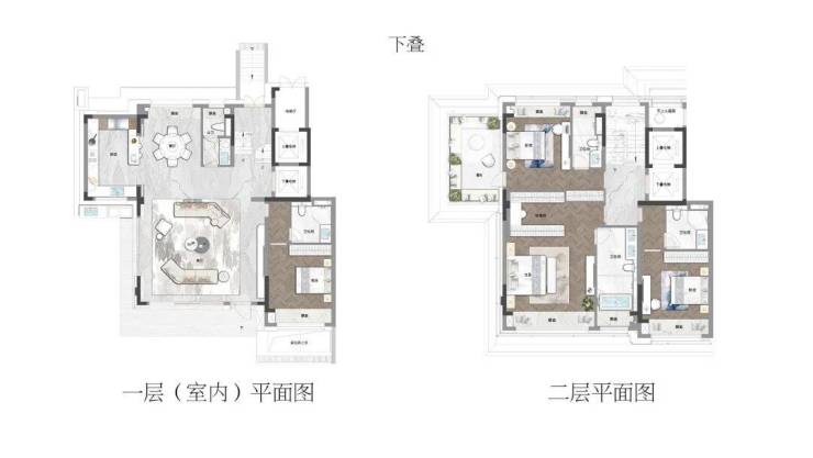 ※一叠双院。上叠户型更为精妙!以建面约280㎡的上叠为例,它直接打破了传统上叠格局。不仅拥有独立的首层入户花园,还与下叠分别配备独立的室内电梯!墅居的尊享感和私密性。