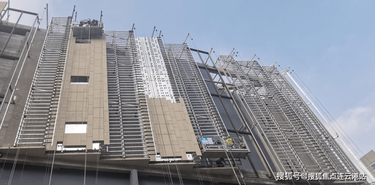 石材幕墙单榀重量平均为16.36吨,总重147.2吨,其悬挑立柱结构受力复杂,龙骨的进出位各不相同,龙骨的定位与焊接是施工难点,施工过程中对石材幕墙龙骨提出四项措施:一是整体钢架采用下托上吊方式加强,顶部增加一道连接件;二是在3层位置根据石材齿状造型增加结构飘梁,整体钢架采用下托上吊方式加强;三是主龙骨层间支座上下位置增加角钢焊接,加强支座;四是横梁位置增加连接件,采用螺栓连接,确保在横向12米横架之间起到伸缩作用。通过项目部精心组织施工,主次龙骨全部焊接完成并通过验收,符合二级焊缝的检测要求后进行石材面板安装。错缝+荔枝面黄麻石材形成一体化设计,实现建筑表皮质感及立面美学的精确控制。