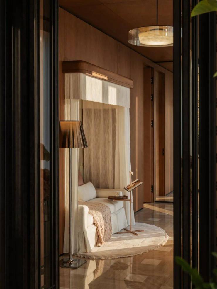 生活的本质,除了偶尔的盛大,还有日复一日的质感。空中花廊连接着客厅与更私密的区域,却从不只是“走廊”。一隅读书角,时光流转,四季在此皆浪漫。