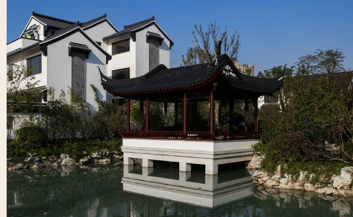 建筑风格:纯中式江南山水别墅,粉墙黛瓦,三进四院设计,融入苏式园林景观