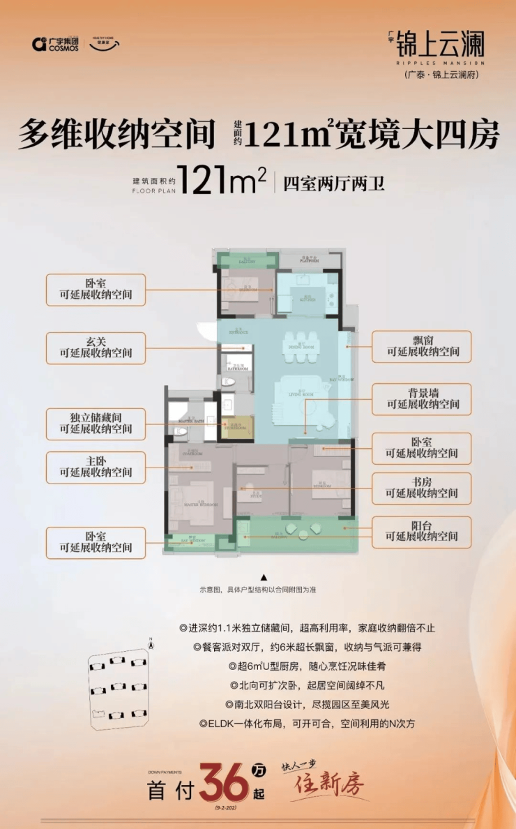 户型:主力户型为99-121平方米三至四房,另有少量160平方米顶楼房源,得房率约77.8%。