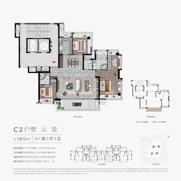 180㎡;4+1室2厅3卫横厅布局+全景落地窗,灵活空间