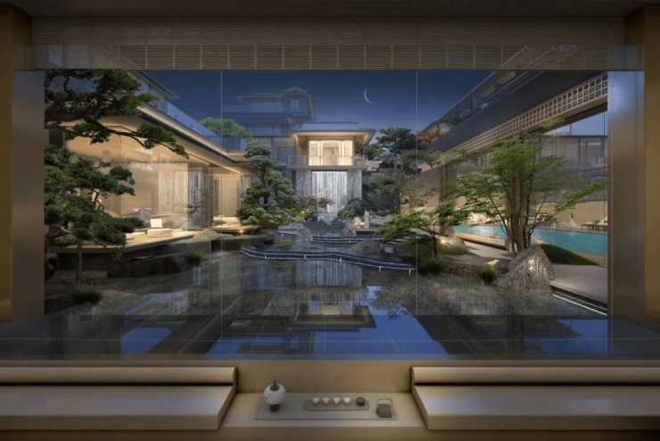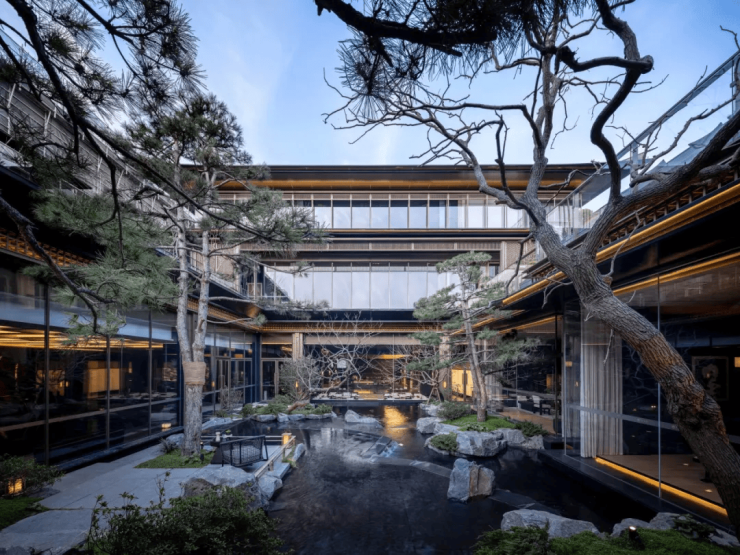 细节雕琢:歇山重檐、纳福悬鱼、黛墨青瓦、瘦金披檐等传统元素与现代材质结合,AKASA万界设计将吴昌硕篆刻美学融入建筑细节。