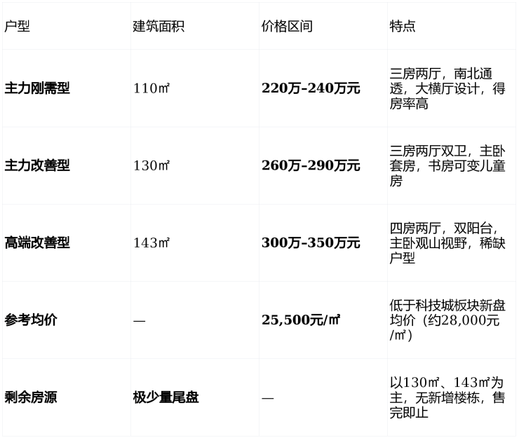 最新价格 :均价 25,000–26,800元/㎡ ,主力户型总价 220万–350万 ,尾盘极少