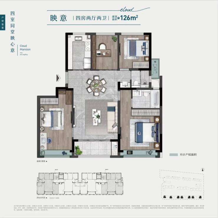 以建面约126㎡四房两厅两卫户型为例,不仅使用率高,而且空间感很足。此外,大四居的设计,对于三胎的家庭来说也能满足居住需求,免去置换的繁琐。