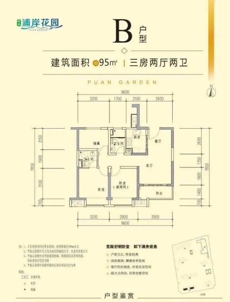 建面约95-116㎡:三室两厅两卫,三开间朝南