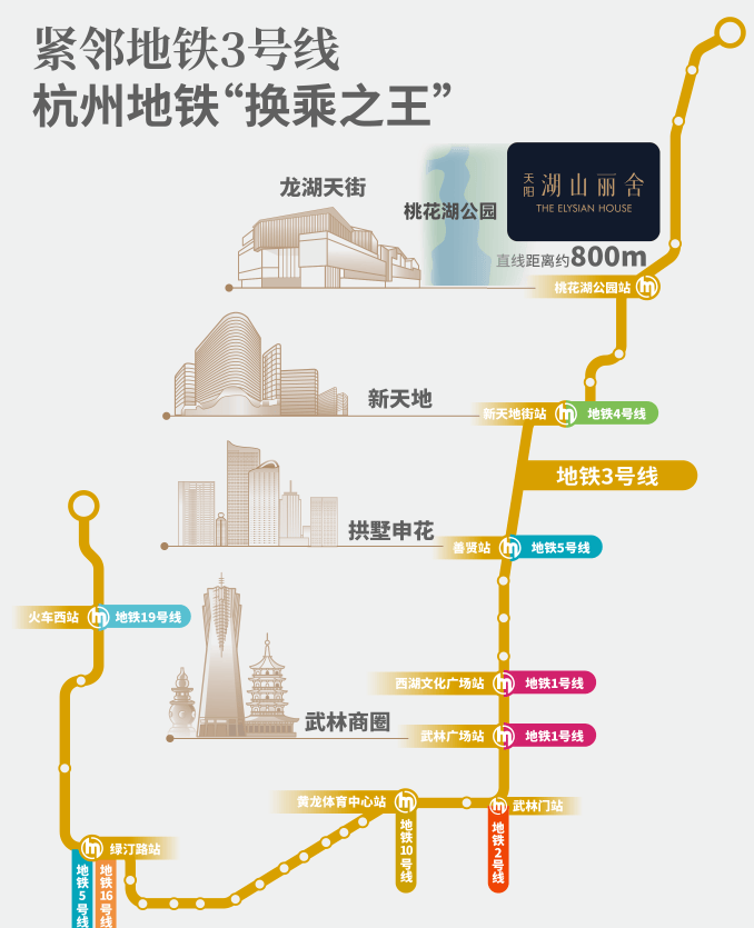 3号线“桃花湖公园站”,步行约5–8分钟(400–500米)直达,4站至武林广场,7站抵钱江新城;