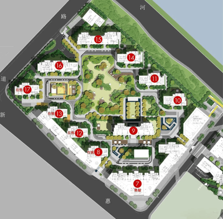 主力户型122-166㎡三居四居,精装交付,部分楼栋南偏西15度布局,楼间距达128米,中央景观花园约8000㎡