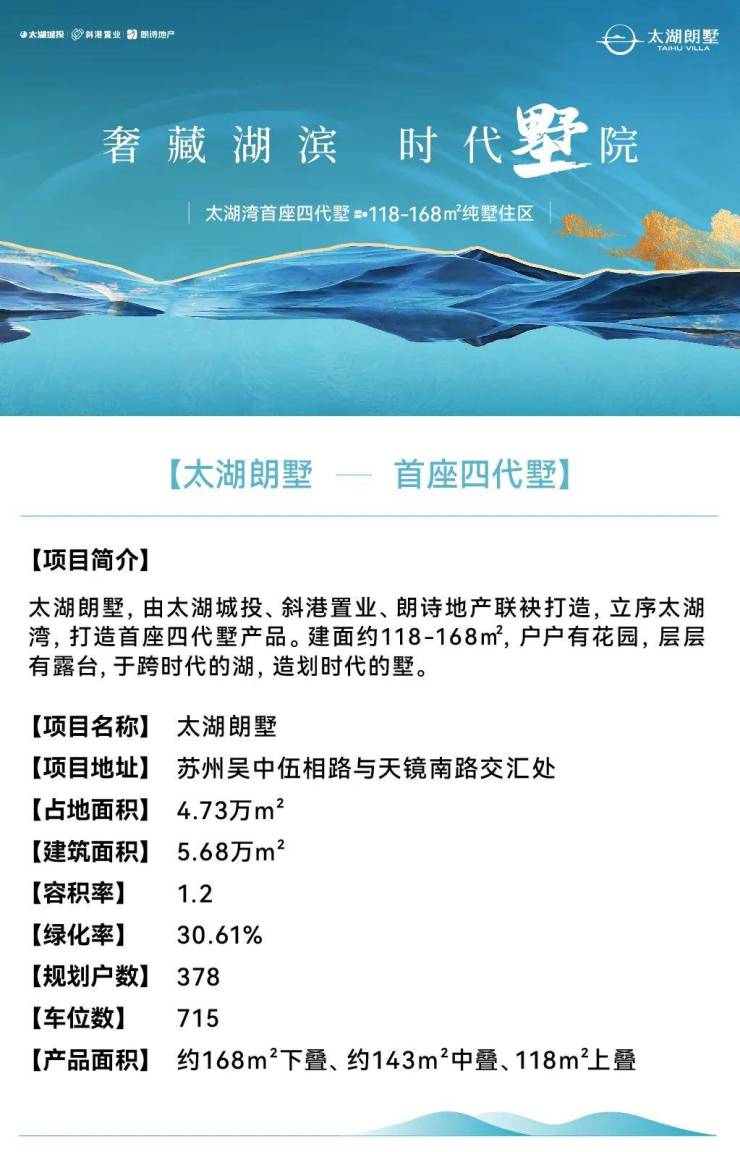 太湖朗墅是苏州吴中太湖度假区首个纯墅四代宅项目,由太湖城投、斜港置业和朗诗地产三大实力开发商联合开发 。项目占地约4.73万㎡,总建面5.68万㎡,容积率仅1.2(板块最低),规划24栋6层纯叠墅共378户,定位为太湖湾高端湖居产品。