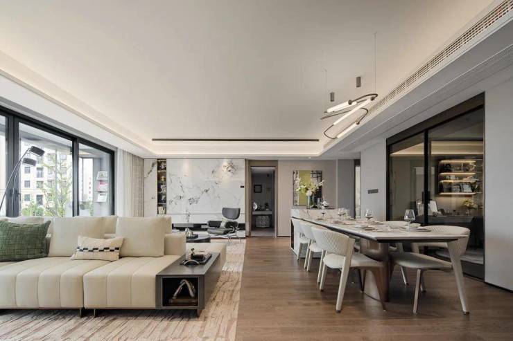 如此阔达的巨幕宽厅,不仅是吸纳阳光与清风的自然容器,也是满足居家休闲、家宴聚会、洽谈会客等复合需求的交互场域,呼应高阶圈层宽广的气度与胸怀,排场尽显,风光体面。