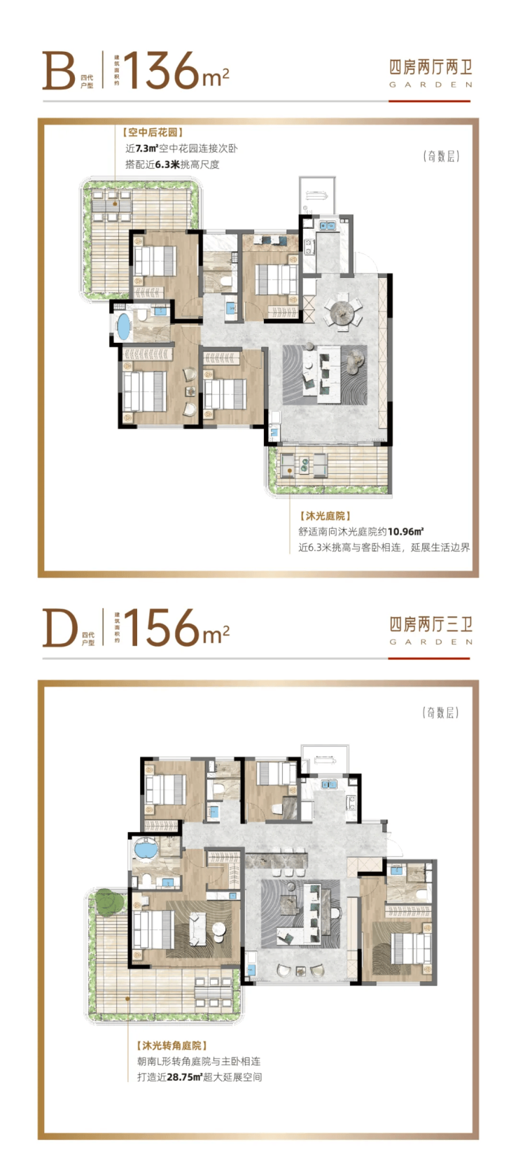 136㎡奇数层户型设双庭院(转角后花园 + 沐光庭院),156㎡户型通过L形转角庭院连接主卧,拓展近28.75㎡延展空间,兼顾私密与开放。