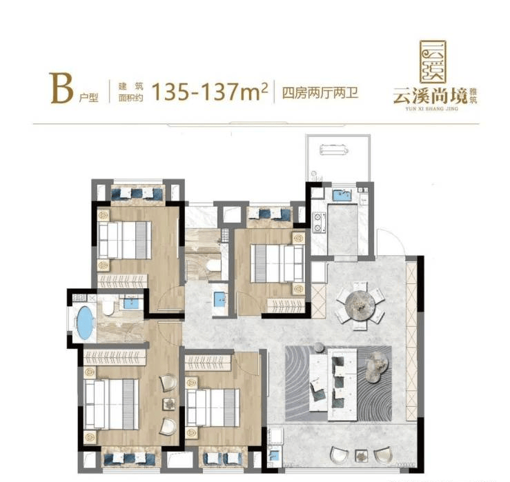 建面137-146㎡四居180-220万客餐厅面宽5.7米,主卧套间设计,适合改善型家庭