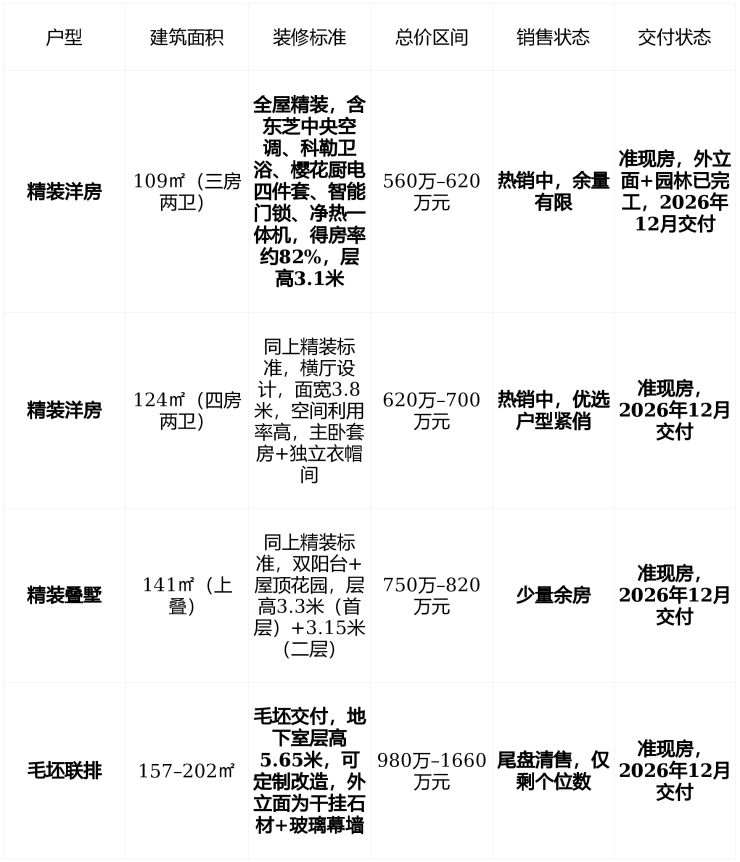 🏡 在售情况:准现房发售,2026年12月交付,精装洋房成主力