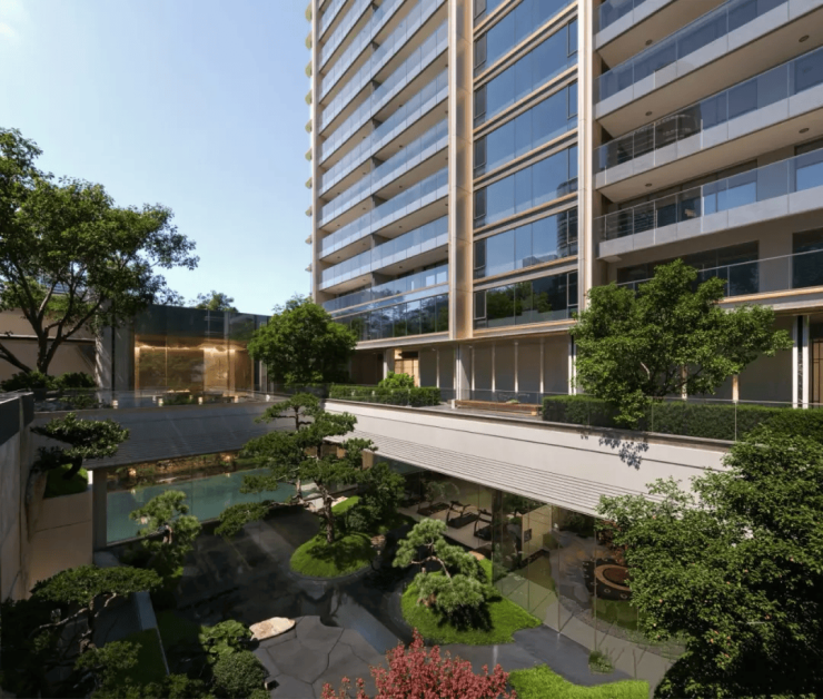 以北宋范宽《溪山行旅图》为灵感,打造“松川九境”立体山水画卷。建筑立面采用浅灰铝板+玻璃幕墙+金色线条点缀,融合现代美学与东方意境,社区内部设风雨连廊、观景平台,增强可逛性与归属感 。