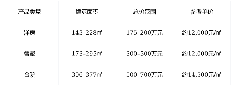 产品类型 :洋房、叠墅、合院三类产品并存, 目前在售主力为洋房与叠墅 ,合院因政策限制(“禁墅令”)已进入尾盘, 仅余少量席位 ,属于“买一套少一套”的收藏级产品。