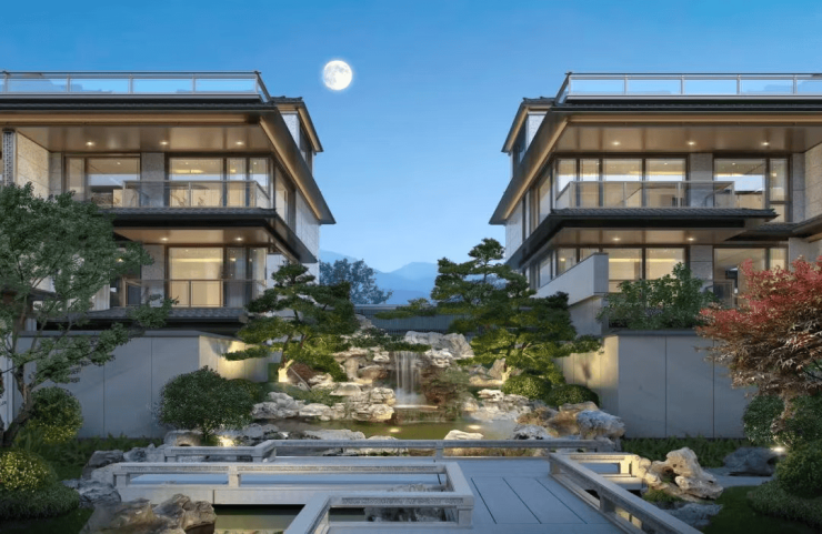 以“宋韵今形”为设计灵感,融合宋式美学与现代奢居,外立面采用伊朗进口“蓝眼睛”奢石、铝板和大面玻璃(三玻两腔工艺)。