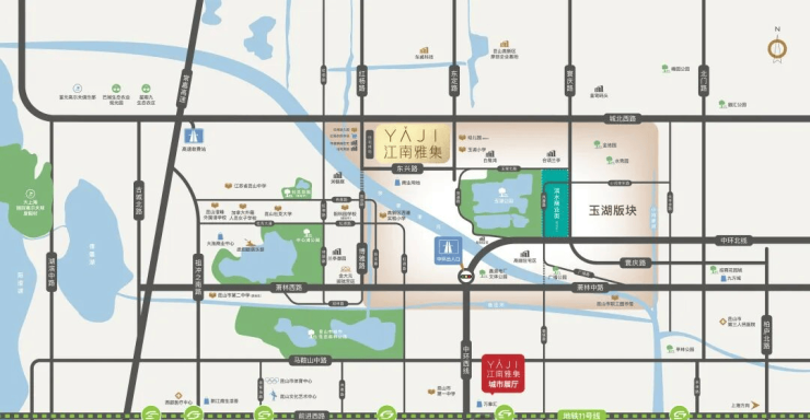 江南雅集作为昆山城西双湖板块的标杆项目,由昆山市东定置地有限公司(国企背景)开发,定位为改善型低密社区。 项目位于巴城镇东定路与东兴路交叉口,西侧600米即达500亩玉湖公园,东距中心湖公园1.8公里,坐拥"双湖生态"稀缺资源。