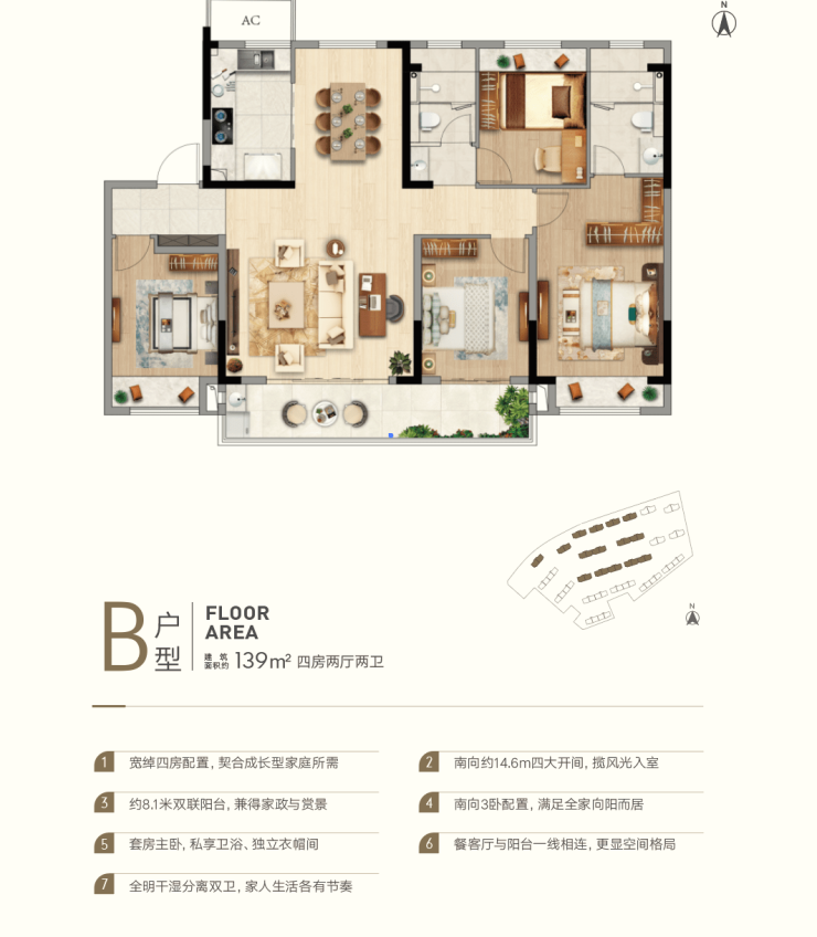 其中139㎡户型栋楼位于社区中间,依主轴景观而立,大开间朝南设计形成奢阔面宽,放大每户的视野与采光。居家空间的每一个角落饱览不加遮挡的自然风光,尽享生活的惬意。