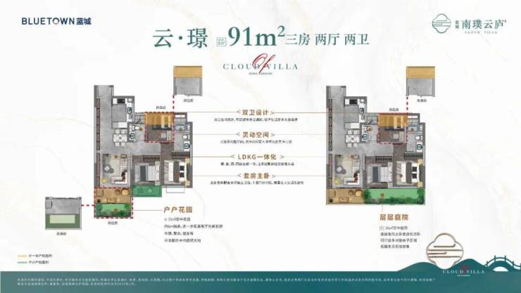 92㎡三房两厅两卫:采用LDKG四维交互系统,客餐厨阳台一体化布局,搭配约9㎡空中庭院,南向面宽充足,采光通风佳,满足刚需家庭需求;