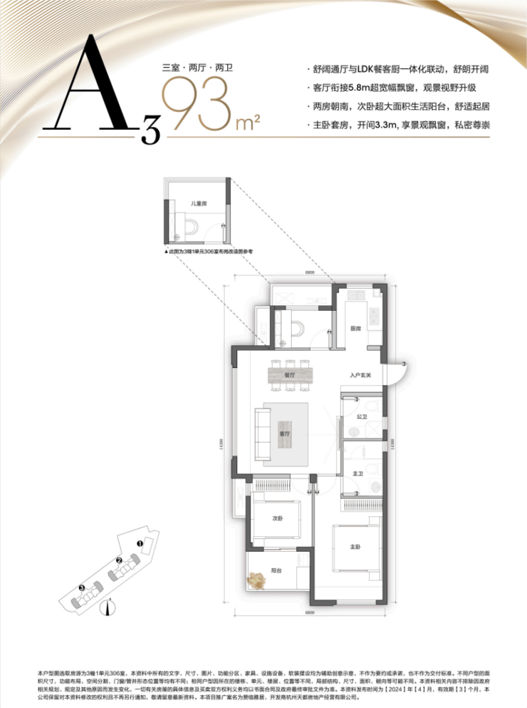 A3户型:3室2厅2卫,建筑面积约93㎡,总价约149万元起