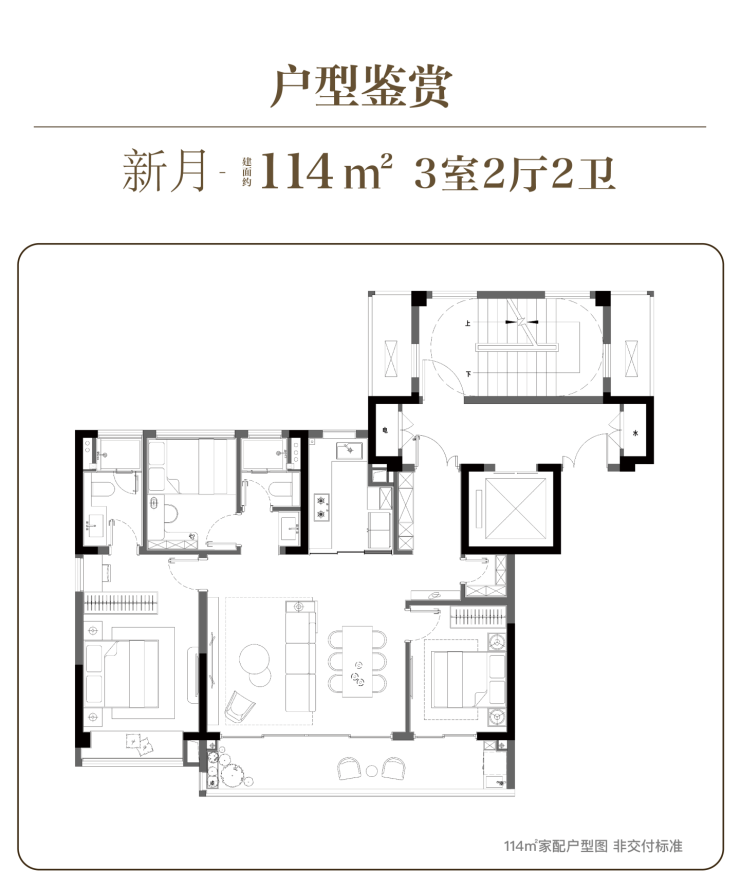 114㎡三室两厅:南向三开间,主卧套房设计,适合三口之家。