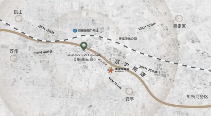 地处 花桥国际商务区 ,距上海地铁11号线花桥站约 4.4公里 ,驾车约15分钟可达;紧邻京沪高速花桥出口(仅1.5公里),25分钟直达上海虹桥商务区