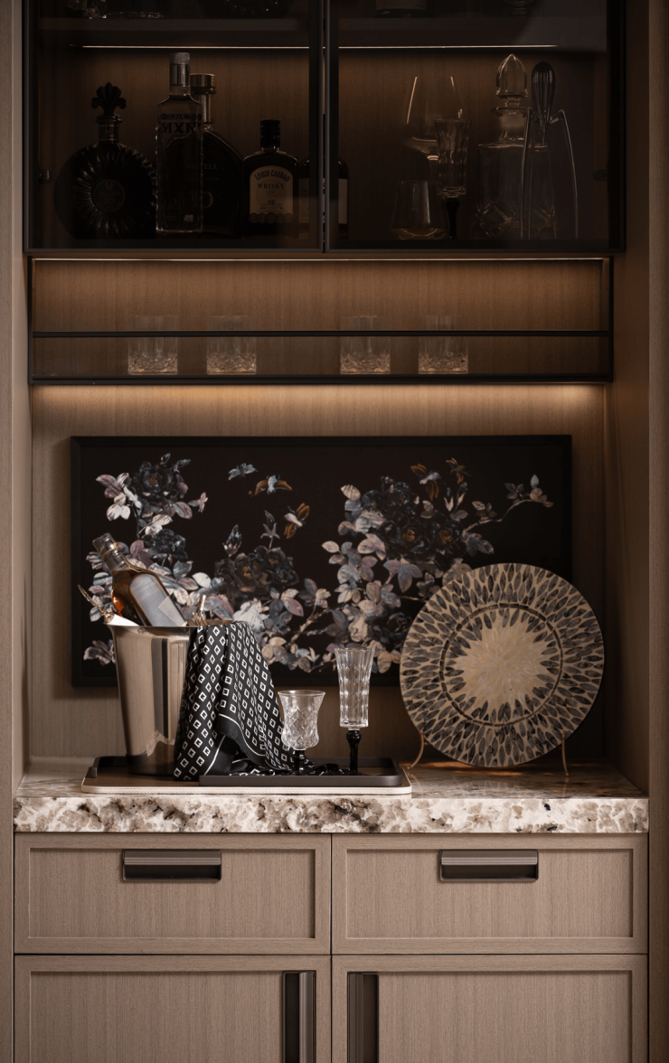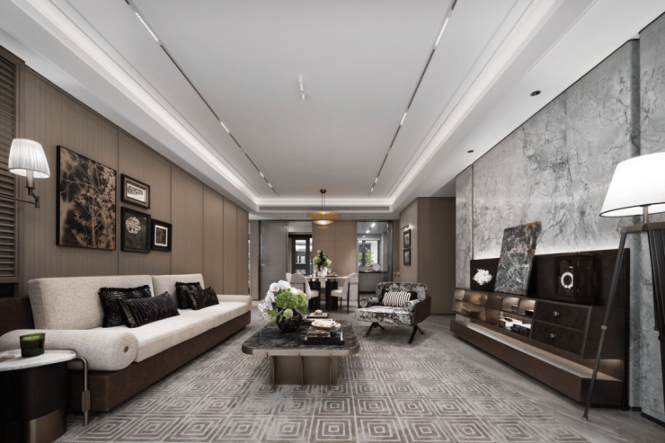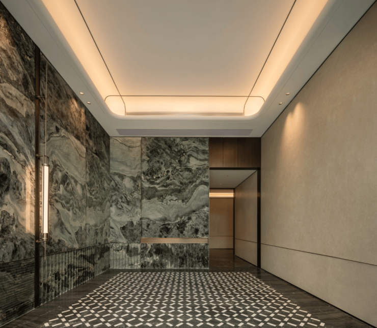 酒店式入户大堂的营造,精选雪山飞狐奢石,高山流水奢石、星白奢石等奢材。