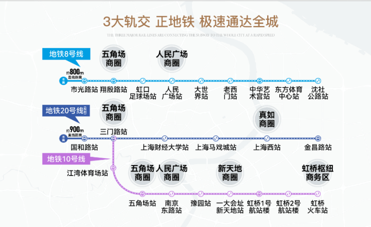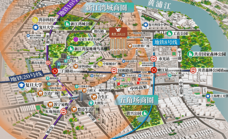 交通立体,三横二纵三轨交立体交通网。直线距离约800米就是8号线市光路站、还有20号线(规划)国和路站和10号线三门路站,串联起五角场、虹口足球场、静安、人民广场、新天地、淮海路等核心商圈。