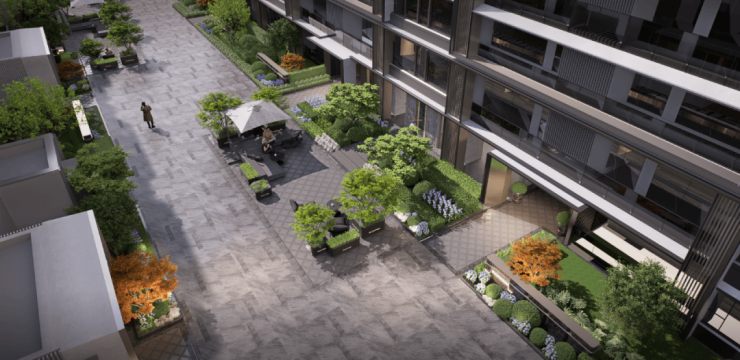 为了给业主一个完美的归家仪式感,项目设计了长约35m宽,约5.1m高奢阔门头,且有名贵黑松迎客。
