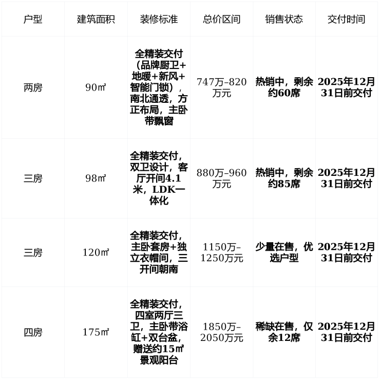 在售状态 : 建面90–175㎡全精装2–4房 , 均价10.5万元/㎡ , 总价747万–2050万元 , 准现房交付(2025年12月31日前) , 西区已实景呈现,可实地看房 , 得房率约73%–75% , 物业为绿城服务,物业费7.8元/㎡·月 。