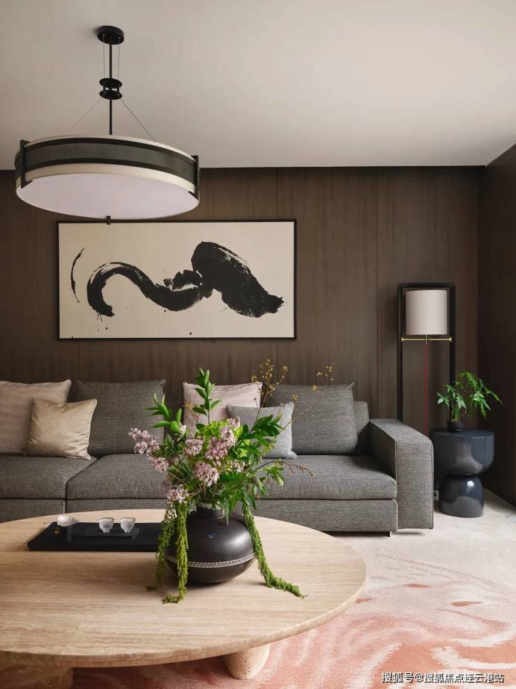 来到地下一层社交客厅,设计师通过水墨的意境连接园景与室内,流水波纹似的整铺地毯将素简庄重的灰色主沙发和单人椅衬托为坚实的磐石,浅色的木质茶几则平衡了过于沉稳的色调。