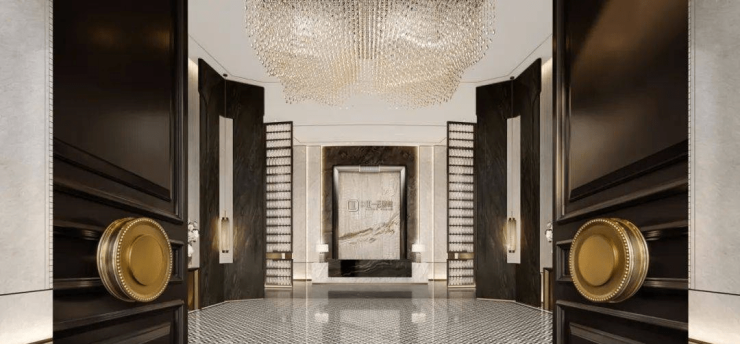 外立面:以“凌云松”为灵感,采用流线型玻璃幕墙+香槟金铝板,复刻御潮府墅境美学