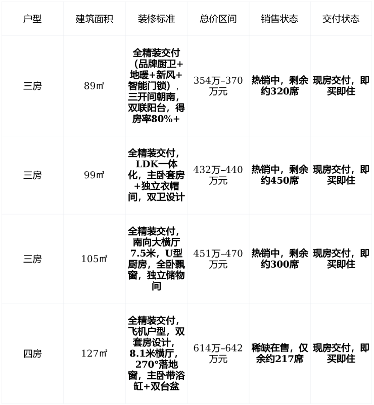 在售状态 : 建面89–127㎡全精装三房 , 均价4.8万元/㎡ , 总价354万–642万元 , 现房交付(2025年10月已竣工) , 剩余房源约1287套 , 得房率超80% , 物业为陆家嘴物业,费5元/㎡·月 。