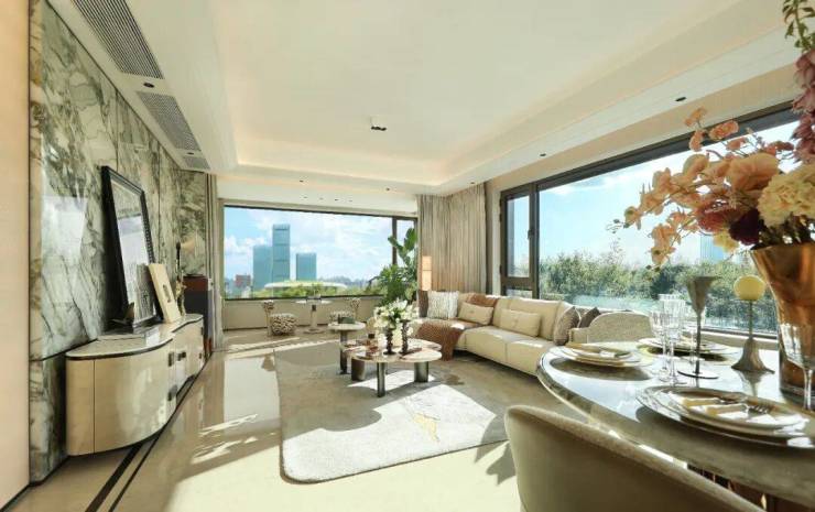 该户型客餐尺度达7.5米观景面,270°极致环幕窗景,最大化引景入室,百万方森态谧境成为私享级流动窗景。