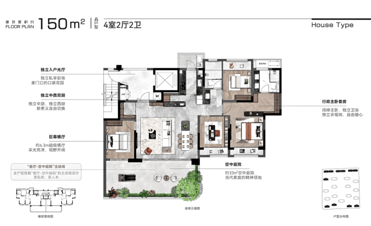 主力户型150–220㎡,全系四开间朝南,南北通透,客厅与阳台一体化设计,空间通透性行业领先。