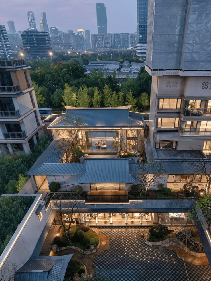 项目以“王府中式”为设计内核,打造约53米宽、10.89米高歇山顶门庭,配黄铜狮镇宅、蓝翡翠奢石景墙、百年罗汉松迎宾,入户即享尊崇仪式感。园林融合“柳浪闻莺”“花港观鱼”等西湖十景元素,辅以雾森系统与风雨连廊,四季皆景,移步换景。