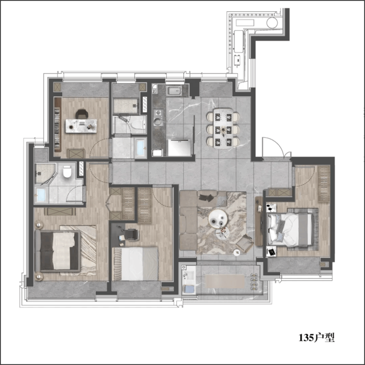 建面约85–135㎡,主打三房至四房改善户型全系精装交付,无刚需小户型,得房率约76–78%