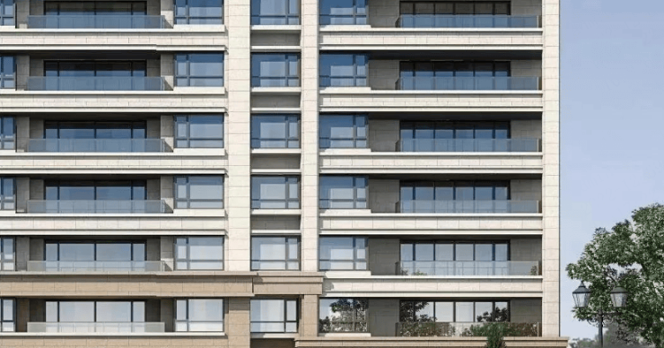 建筑设计:经典三段式立面,融合几何线条与金属质感