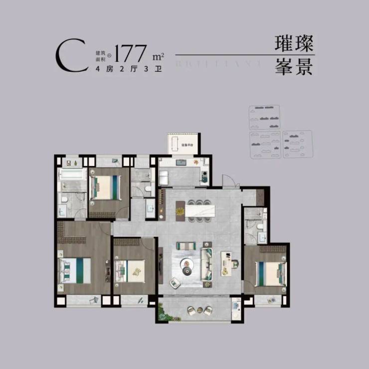 项目主力为四居室改善户型,得房率76-88%,具体配置如下: