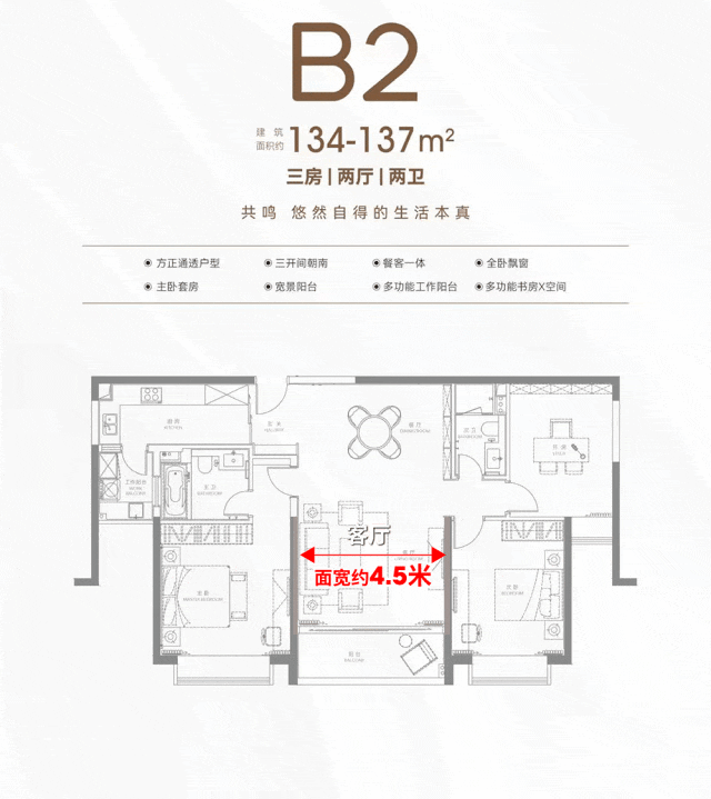 B2户型客厅面宽同样达约4.5米,主卧面宽约4米,开间尺度阔绰。