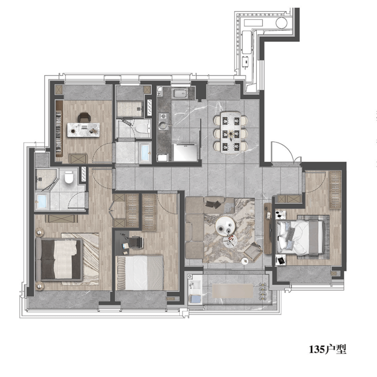 项目摒弃传统高密度塔楼模式,采用小高层+洋房组合,营造低密舒适居住氛围,外立面以玻璃幕墙+铝板+石材基座构成现代简约风格,搭配晶体塔冠设计,整体视觉通透、光感强烈,契合当代城市精英对美学与品质的双重追求。